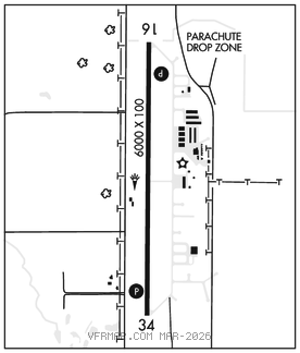 AIRPORT REMARKS: Attended 1400–0200Z‡. Fuel avbl 24 hrs. Parachute Jumping. Parachute activity east of rwy. Crop duster ops on and invof arpt. Non–radio acft based at KDWA. Birds on and invof arpt. Arpt ops (530) 759–8766. Unlit 40′ p–line and 120′ trees 500′ west of rwy centerline. Unlit wind turbine 95′ AGL 1000′ west of rwy centerline. No touch and go ldg 0600–1400Z‡. Rwy 34 calm wind rwy.