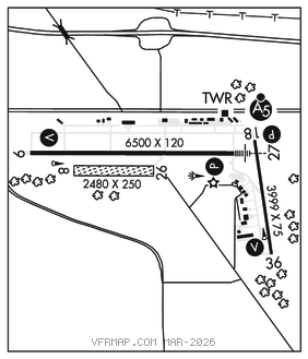 AIRPORTREMARKS:Attended 1100–0300Z‡. Rwy 08–26 mkd white corner mkrs. VFR ops during twr hrs only. Twy mkd with reflectors, Twy A unavbl to acft with more than 30 pax seats. Rwy 18–36 cntrln and striping faded.
