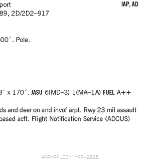 AIRPORT REMARKS: Attended 1330–2200Z‡. Rwy 14–32 CLOSED dusk–dawn. Deer on and invof arpt. Uncontrolled vehicles Rwy 32 crossing thr. For aftr hrs serv call amgr during bus hrs. All fueling 24 hr self service. Rwy 05–23 & Rwy 14–32 2–12 inch deep drainage structures on paved shoulders. Rwy 14–32 mkgs faded. Rwy 23, 68 ft athletic fld lgts, 550 ft south of rwy centerline. Cold temperature airport. Altitude correction required at or below –19C.