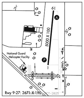 AIRPORT REMARKS: Attended 1300–2300Z‡. Attended irregularly on Christmas, New Years; Easter and Thanksgiving. Fuel: 100LL self serve avbl. National Guard helipad and helicopter facility lctd west of arpt. Helicopter tfc all hrs. Rwy 09–27 dspld thlds marked with yellow cones. Rwy 27 end begins west side of Twy A, grass line marks rwy edges.