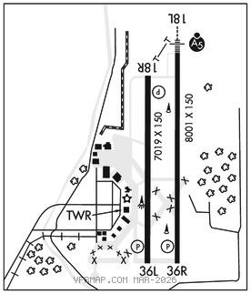 RWY 18L–36R: H8001X150 (ASPH–GRVD) S–75, D–112, 2S–142, 2D–182, 2D/2D2–540 PCN 61 F/D/X/T HIRL