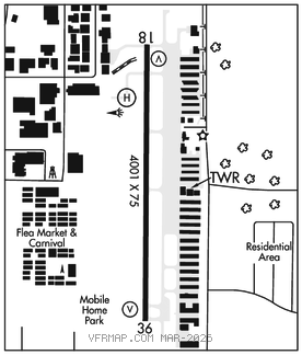 AIRPORT REMARKS: Attended Mar–Oct Mon–Sat 1400–0200Z‡, Nov–Feb Mon–Sat 1400–0200Z‡, Sun 1400–0100Z‡. Extsv hel tfc west side of arpt. 165′ water twr, 1/4 mile west of Rwy 18–36. TPA–1400 (812) fixed wing, 1200 (612) rotary wing. West grass for rotary wing use only. No ADS–B billing or ldg fees. GA tsnt ramp free for short term only.