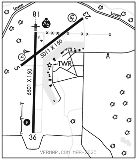 RWY 18–36: H6501X150 (ASPH) S–100, D–176, 2S–175, 2D–300, 2D/2D2–560 HIRL