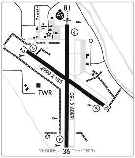RWY 18–36: H6509X150 (CONC–GRVD) S–116, D–224, 2S–89, 2D–406, 2D/2D2–907 PCN 63 R/B/W/T MIRL
