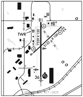 RWY 18–36: H7339X150 (ASPH) S–75, D–175, 2S–175, 2D–350 PCN 28 F/C/X/U HIRL 0.5% up N