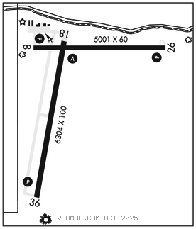RWY 18–36: H6304X100 (CONC–GRVD) S–45, D–55, 2D–100 PCN 12 R/B/W/U MIRL 0.4% up S