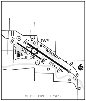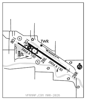 RWY 10L–28R: H5904X150 (ASPH–GRVD) S–60, D–200, 2S–175, 2D–400 PCN 38 F/C/X/T HIRL 0.3% up W