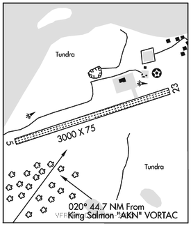 KING SALMON (H) (H) VORTACW 112.8 AKN Chan 75 N58°43.48′ W156°45.14′ 020° 44.7 NM to fld. 95/16E. TACAN antenna offset 150′ se