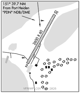 PORT HEIDEN NDB/DME (HW) 371 PDN Chan 32 N56°57.26′ W158°38.85′ 151° 39.7 NM to fld. 56/16E.