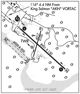 KING SALMON (AKN)(PAKN) P (AF) 0 SE UTC–9(–8DT) N58°40.59′ W156°38.92′