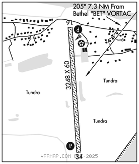 BETHEL (H) (H) VORTACW 114.1 BET Chan 88 N60°47.09′ W161°49.46′ 205° 7.3 NM to fld. 105/14E.