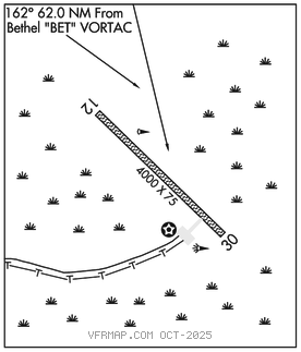 BETHEL (H) (H) VORTACW 114.1 BET Chan 88 N60°47.09′ W161°49.46′ 167° 62.0 NM to fld. 105/14E.