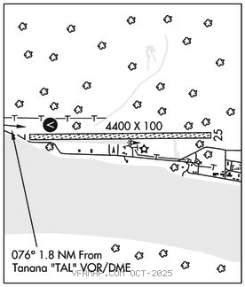 TANANA (H) (H) VORW/DME 116.6 TAL Chan 113 N65°10.63′ W152°10.65′ 076° 1.8 NM to fld. 394/19E.