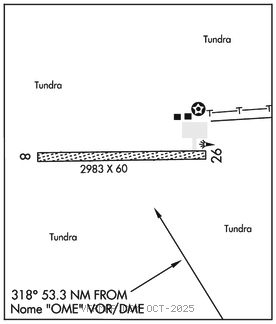 NOME (H) (H) VORW/DME 115.0 OME Chan 97 N64°29.11′ W165°15.19′ 318° 53.3 NM to fld. 95/11E.