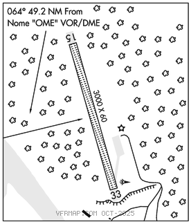 NOME (H) (H) VORW/DME 115.0 OME Chan 97 N64°29.11′ W165°15.19′ 064° 49.2 NM to fld. 95/11E.