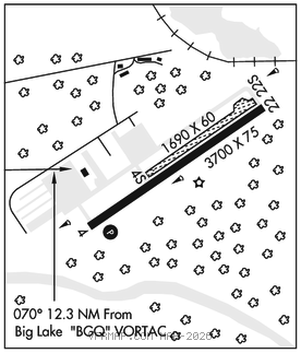 BIG LAKE (H) (H) VORTACW 112.5 BGQ Chan 72 N61°34.17′ W149°58.03′ 070° 12.3 NM to fld. 179/19E.