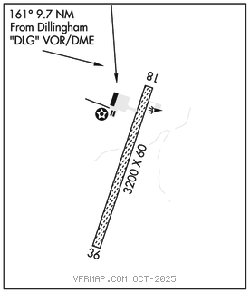 DILLINGHAM (H) (H) VORW/DME 116.4 DLG Chan 111 N58°59.65′ W158°33.13′ 161° 9.7 NM to fld. 81/15E.