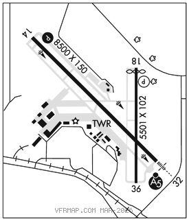 RWY 18–36: H5501X102 (ASPH–GRVD) S–75, D–105, 2D–190 PCR 325 F/A/X/T MIRL 0.3% up N
