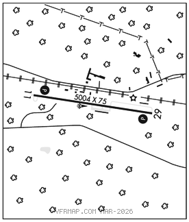 AIRPORT REMARKS: Attended Mon–Sat 1300–2300Z‡, Sun 1800–2300Z‡. Deer on and invof arpt. Road lctd 200′ south of RCL. Rising terrain 10′ high lctd north of Rwy 11–29 starting from RCL. Rwy 29 apch: trees 36′ tall, lctd 452′ from rwy end, 280′ south of RCL. Trees 57′ tall, lctd 770′ from rwy end, 295′ south of RCL. Trees 66′ tall, lctd 992′ from rwy end, 30′ south of RCL.