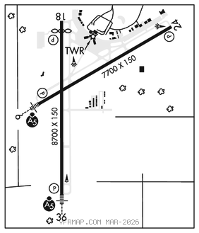 RWY 18–36: H8700X150 (CONC–GRVD) S–120, D–170, 2S–175, 2D–290 PCR 520 R/B/W/T HIRL