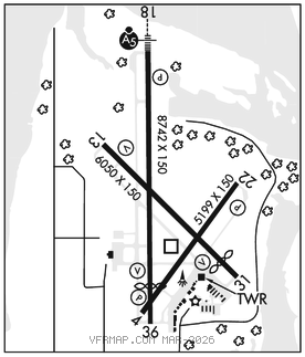 RWY 18–36: H8742X150 (CONC–GRVD) S–120, D–200, 2S–175, 2D–340, 2D/2D2–810 PCR 630 R/B/W/T HIRL