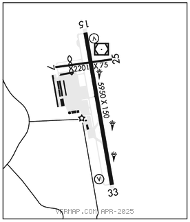 RWY 15–33: H5950X150 (ASPH) S–65, D–90, 2S–114, 2D–190 PCN 15 F/C/W/T MIRL 1.2% up S