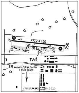 AIRPORTREMARKS: Attended 1700–0100Z‡. For jet fuel aft hrs call FBO at 619–671–9222, fee for callout. Mil fuel avbl by calling 619–671–9222. Parachute Jumping on arpt and 3 miles east. Be alert to arpt boundary one mile north from Mexican/USA international border. Be alert when departing on Rwy 08L at night due to rising terrain to the east. Be alert to high terrain 3,566′ MSL 6 miles east of arpt. Rwy 08R–26L operator permits only 12500 lbs. No engine ops on ramps except as necessary for arrivals and departures. Twy G west of Twy B rstd to acft with wingspans of 133′ or less. Avoid direct overfight of PIO PICO energy center blo 2000′ AGL, 3NM east of arpt. TPA–1526(1000) Rwy 08L–26R, 1126(600) Rwy 08R–26L. Flight Notification Service (ADCUS) available. NOTE: See Special Notices–Extensive Parachute Drop Activities San Diego, California.