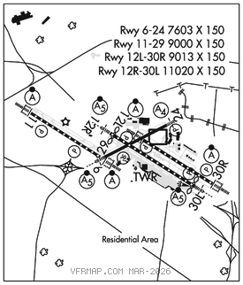 AIRPORT REMARKS: Attended continuously. Fuel: A: Jet–A. Twy D or Taxilane C from Twy S to Twy G, B–747 or larger acft are not authorized to pass or be passed by B–767 or larger acft operating on the parallel Twy/Taxilane. Twy November btn Rwy 24 and Foxtrot, rstrd to acft with a wingspan of less than 79 ft (CRJ–900 or smlr) when acft are parked on the November Pad. This area is rstrd to all opns when acft are performing end run–ups in the November Pad. Taxiway Victor, underlying the Runway 12L final approach course is restricted to aircraft with a tail height of 25′ or less (CRJ–700 or smaller), when aircraft are landing on Runway 12L. Txl Charlie, east of Twy Charlie 2 to Twy G, rstrd to B737 or smlr acft (wingspan less than 118′) when acft are parked on the Hotel pad. Txl Charlie from Twy Charlie Six to Twy Charlie four, rstrd to B757–300 series or smlr when passing bhnd acft that have made the initial 10 ft pushback. Twy A east of Twy T, Twy S and Rwy 06–24 south of Twy B, no acft or vehicle ops when arriving or departing Rwy 11 or arriving Rwy 29. Taxiway Lima, north of Runway 12L–30R, aircraft larger than a Gulfstream VI taxiing northbound are prohibited from making a right turn eastbound on Taxiway Foxtrot. Twy V2 is unavbl to B–767 or larger acft (wingspan 118′ or greater). Twy V2, B–737 (wingspan greater than 79′ but less than 118′) must perform judgmental oversteering instead of cockpit over cntrln steering when tax. Twy K1 is unavbl to B–767 or larger acft (wingspan 118′ or greater). Twy Echo, btn Twy November and Twy Lima rstrd to B–767 or smlr acft (wingspand less than 171 ft) when acft are parked on the Echo Pad. Twy Charlie, fm Twy Sierra to Twy Charlie Seven, rstrd to B–767 or smlr acft (156 ft avbl) when acft are parked in the Charlies Pad. Rstrn is for tax acft, lrgr acft may be towed thru area. Twy Charlie, from Twy Charlie Seven to Twy Charlie Six, rstrd to a B757–300 series or smlr. Wg tip clnc with gnd veh not adqt alg N side of main trml apn. ASDE–X in use. Operate transponders with altitude reporting mode and ADS–B (if equipped) enabled on all airport surfaces. Waiver to conduct simul apchs to parl rys separated by 1,300 ft in efct. Ldg fee: Ldg fee based on acft weight collected by FBO. Flight Notification Service (ADCUS) avbl.