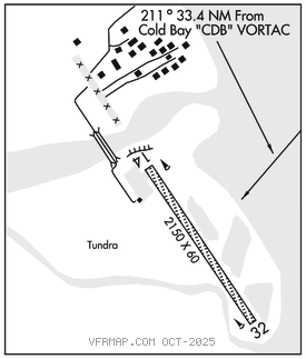 COLD BAY (H) (H) VORTACW 112.6 CDB Chan 73 N55°16.04′ W162°46.44′ 211° 33.4 NM to fld. 99/10E.